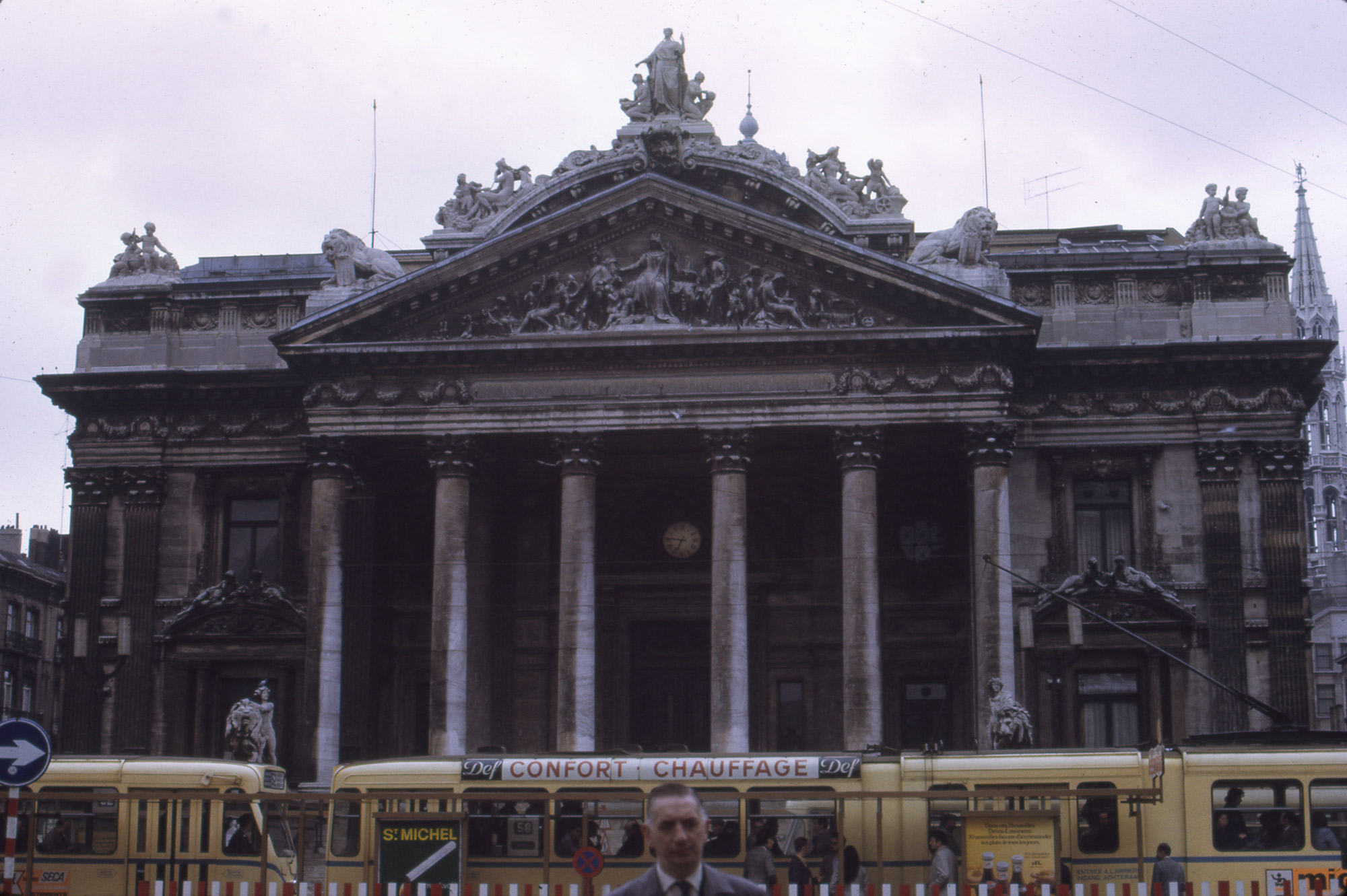 The Bourse Palace (in French, Palais de la Bourse), which was formerly the site of the Brussels Stock Exchange, now the location of the Belgian Beer World Museum. Parked in front of the Bourse is a line of yellow buses. In the foreground, out of focus, is a man in a suit. Annotation on slide reads "Belgium Brussels." Image processing: rotated, cropped.