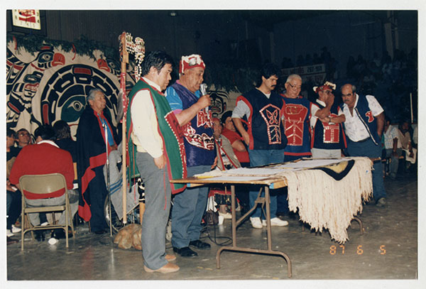 Image of six people standing around a table with records on it. One of them is holding a microphone. More people on the background. Handwritten annotation on back "Bella Coola Treaty. Ernest Willie, Peter Smith, Al Speck, Alvin Alfred, George Speck, Alec Smith" |