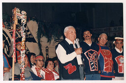 Image is a close up photograph of four people standing around a table. One of them is holding a microphone. More people on the background. Handwritten annotation on back "Bella Coola Treaty with Qwiqwasutinuxca. (L) Bella Coola: Laurance Maru, Puglas Hall, James Sewid, Al Speck, Alvin Alfred, George Speck" |