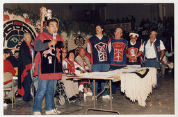 Image of five people stading by a table with records on it. One of them is holding a microphone. More people on the background. Handwritten annotation on back "Bella Coola Treaty. Paul Willie, Al Speck, Alvin Alfred, George Speck, Alec Smith" |