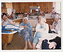 Image of four women sitting in a kitchen.One of them is knitting, one of them is speaking on a telephone. In close up the hands and arms of a fifth person are visible. Handwritten annotation on back "(L) Daisy Smith, Axuw, Flora Sewid, Emma Beans, Jun. 1987" |
