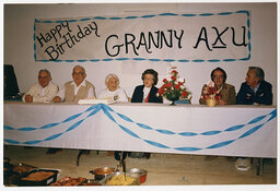 Image of six people sitting by a long table. There is a birthday cake on the table and a poster in the back that reads "Happy Birthday Granny Axu." Handwritten annotation on back "(L) Arthur, Alvin, Axu, Elizabeth (Libby), Phillip, Clarence" |