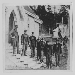 Image of seven people standing on the stairs of a building. One of them is holding a banner. Handwritten annotations on back "James Sewid", "Rev. Alfred James Hall and Church Army Members circa 1895", |