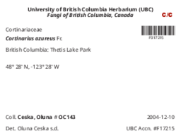 F017215 Beaty Label Summary Content type Content type Digital Document Collection(s) Collection(s) Cortinarius azureus Fr. Resource Type Resource Type Text
