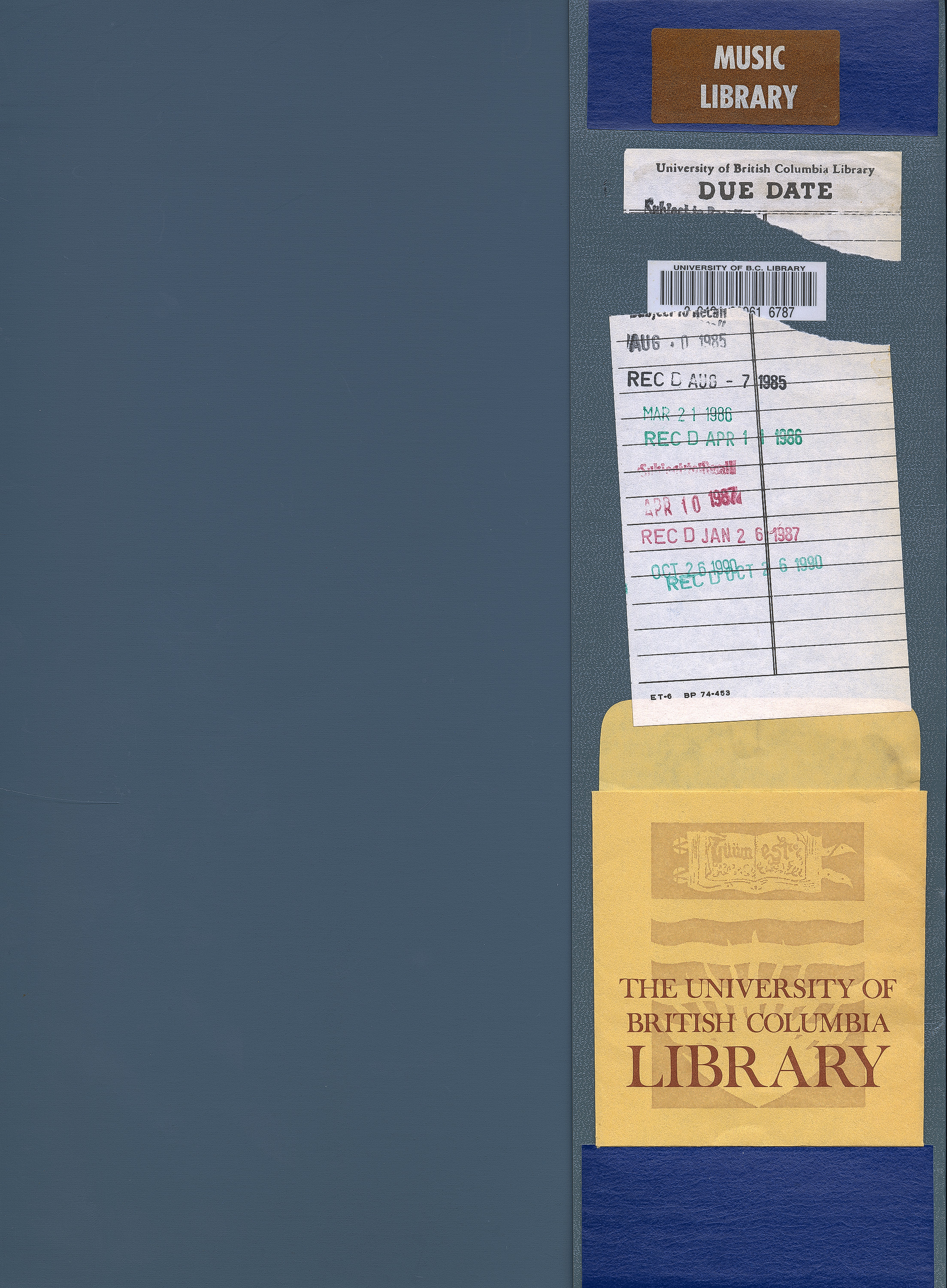 Summary Content type Content type Compound Object Collection(s) Collection(s) Echoes from the Stacks: Borrowing Cards of Music by Underrepresented Groups Resource Type Resource Type Notated music Origin Information Origin Information Place Paris Date Created/Date Issued 1920 Publisher M. Eschig Persons and Affiliations Persons Composer (cmp): Poulenc, Francis Abstract/Description Description / Synopsis Description / Synopsis 4 p. ; 31 cm. Language Language French Institutional Affiliation Institution Institution UBC Identifiers Local Identifier Local Identifier M32.P69 A4 1920 Subjects and Classifications Keywords Keywords French LGBTQ+ Subject Topic Subject Topic piano music Waltzes