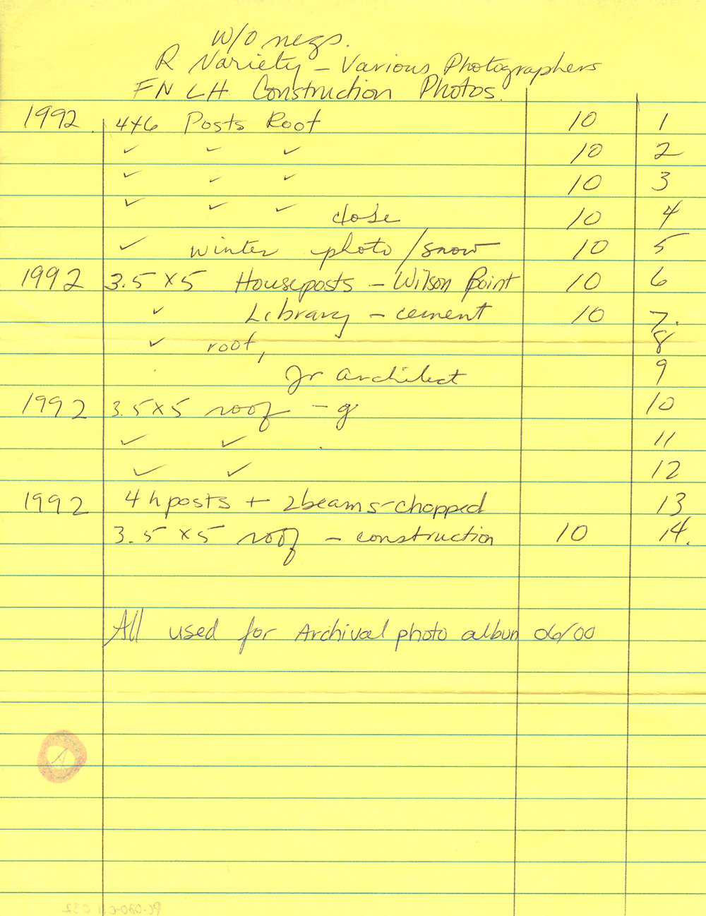 Summary Content type Content type Image Collection(s) Collection(s) First Nations House of Learning Construction Resource Type Resource Type Photograph Genre Genre notes (documents) Abstract/Description Description / Synopsis Description / Synopsis Inventory list of photograph information including date, size, and other numbers. Target Audience Target Audience general Physical Description Extent Extent 1 piece of notebook paper, 22x28 cm Reformatting Quality Reformatting Quality access Digital Origin Digital Origin digitized other analog Identifiers Local Identifier Local Identifier PC-020-011-032 Subjects and Classifications Keywords Keywords First Nations Longhouse (Vancouver, B.C.)--History, First Nations House of Learning, Indian Architecture--British Columbia--Vancouver, First Nations--University of British Columbia, University of British Columbia--First Nations programs Subject Topic Subject Topic First Nations Subject Name Organization Subject Name Organization First Nations House of Learning (FNHL)