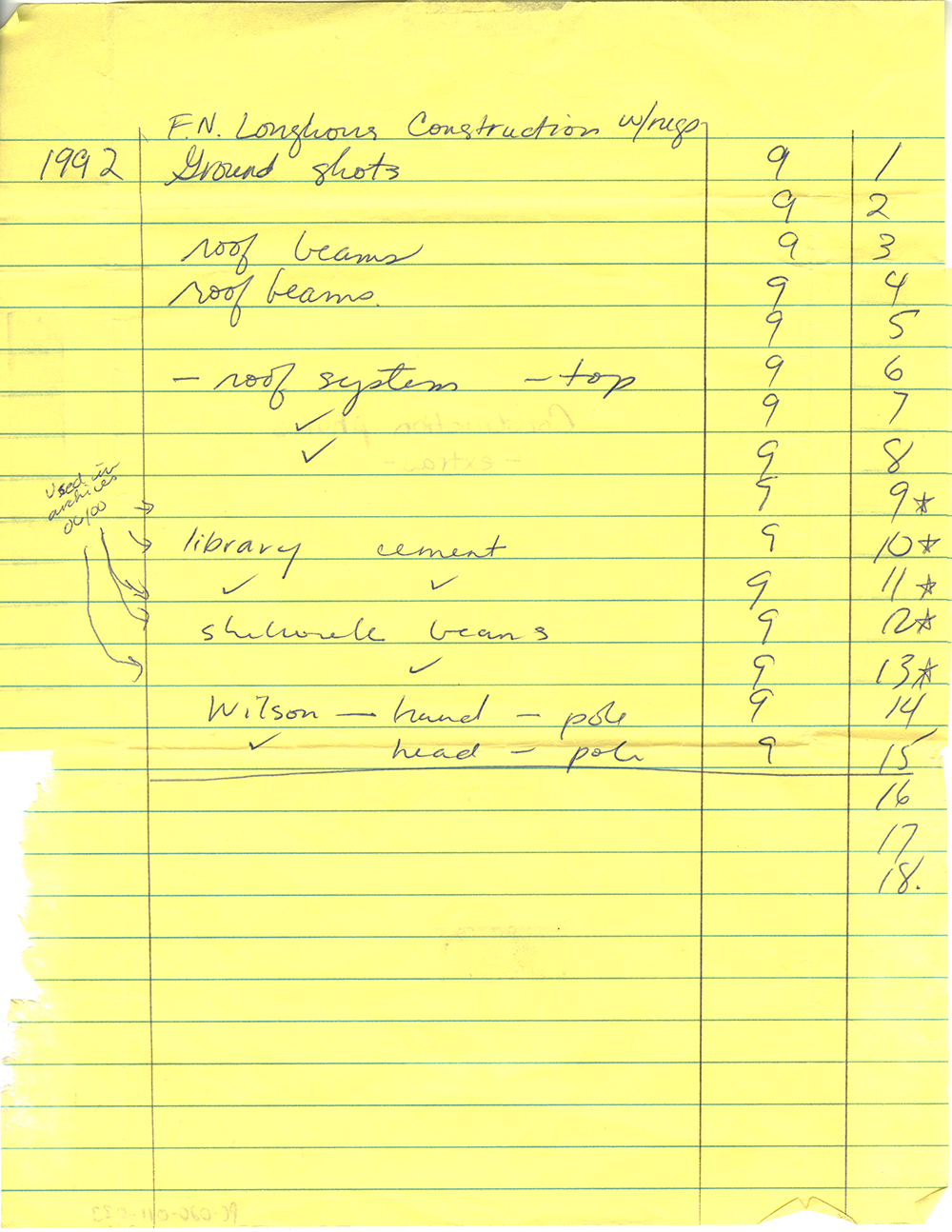 Summary Content type Content type Image Collection(s) Collection(s) First Nations House of Learning Construction Resource Type Resource Type Photograph Genre Genre notes (documents) Abstract/Description Description / Synopsis Description / Synopsis Notebook paper with text about the negatives in the collection including date, description, and numbers. Target Audience Target Audience general Physical Description Extent Extent 1 piece of notebook paper, 22x28 cm Reformatting Quality Reformatting Quality access Digital Origin Digital Origin digitized other analog Identifiers Local Identifier Local Identifier PC-020-011-033 Subjects and Classifications Keywords Keywords First Nations Longhouse (Vancouver, B.C.)--History, First Nations House of Learning, Indian Architecture--British Columbia--Vancouver, First Nations--University of British Columbia, University of British Columbia--First Nations programs Subject Topic Subject Topic First Nations Subject Name Organization Subject Name Organization First Nations House of Learning (FNHL)