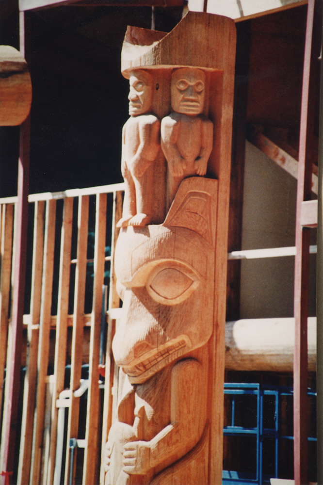 Three humna figures at the top of the housepost represent the students who will come here to learn. Standing tall, one faces left, one faces forward, one faces right. The stylized wolf figure below has a human quality in that it is standing upright holding a young pup in its hands. The hands have the look of claws on extended human fingers. The feet look like human feet. The head looks like a stylized ceremonial mask. The pup is more realistic looking. Its head, ears, face, snout, body shape, paws, and tail are naturalistic (p. 44, The First Nations Longhouse)