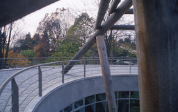 The Pit House structure as seen from the upper centre. The posts extend down in a design inspired by the pit house structures used as winter dwellings by the Interior Salish.