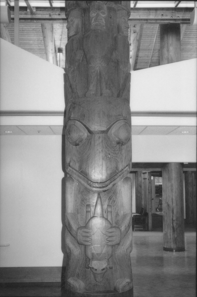 The Wolf and Wolf Pup Housepost sits in the northwest corner of Sty-Wet-Tan and was carved by Chief Walter Harris and his son Rodney Harris of the Gitxsan Nation.