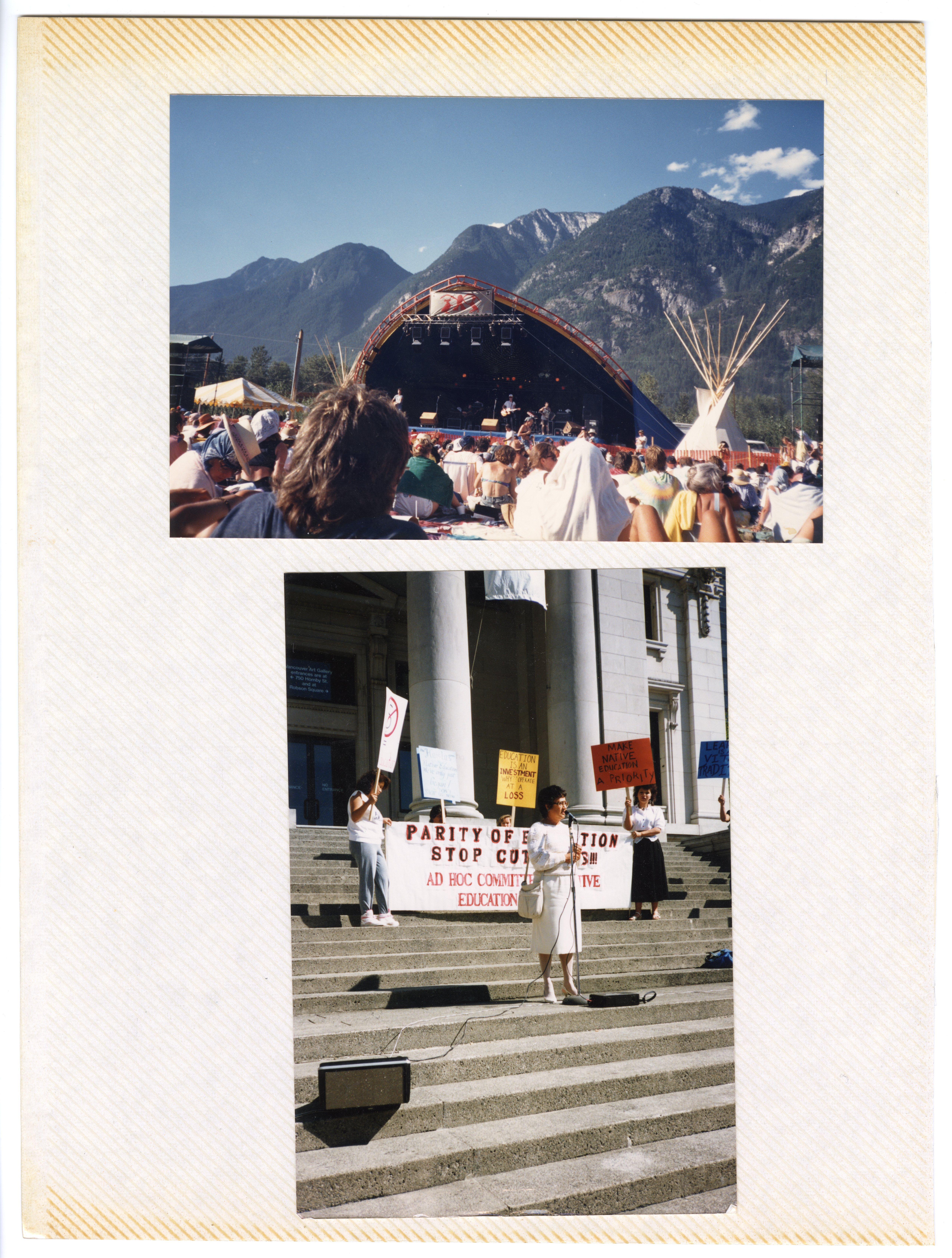 Two photographic prints. Upper photograph shows a stage at the Stein Valley Voices for the Wilderness Festival, a music festival in Mount Currie, BC that drew attention to issues of wilderness preservation and the concerns of Indigenous groups. Lower photograph shows a speaker at a protest held in front of the Vancouver Art Gallery