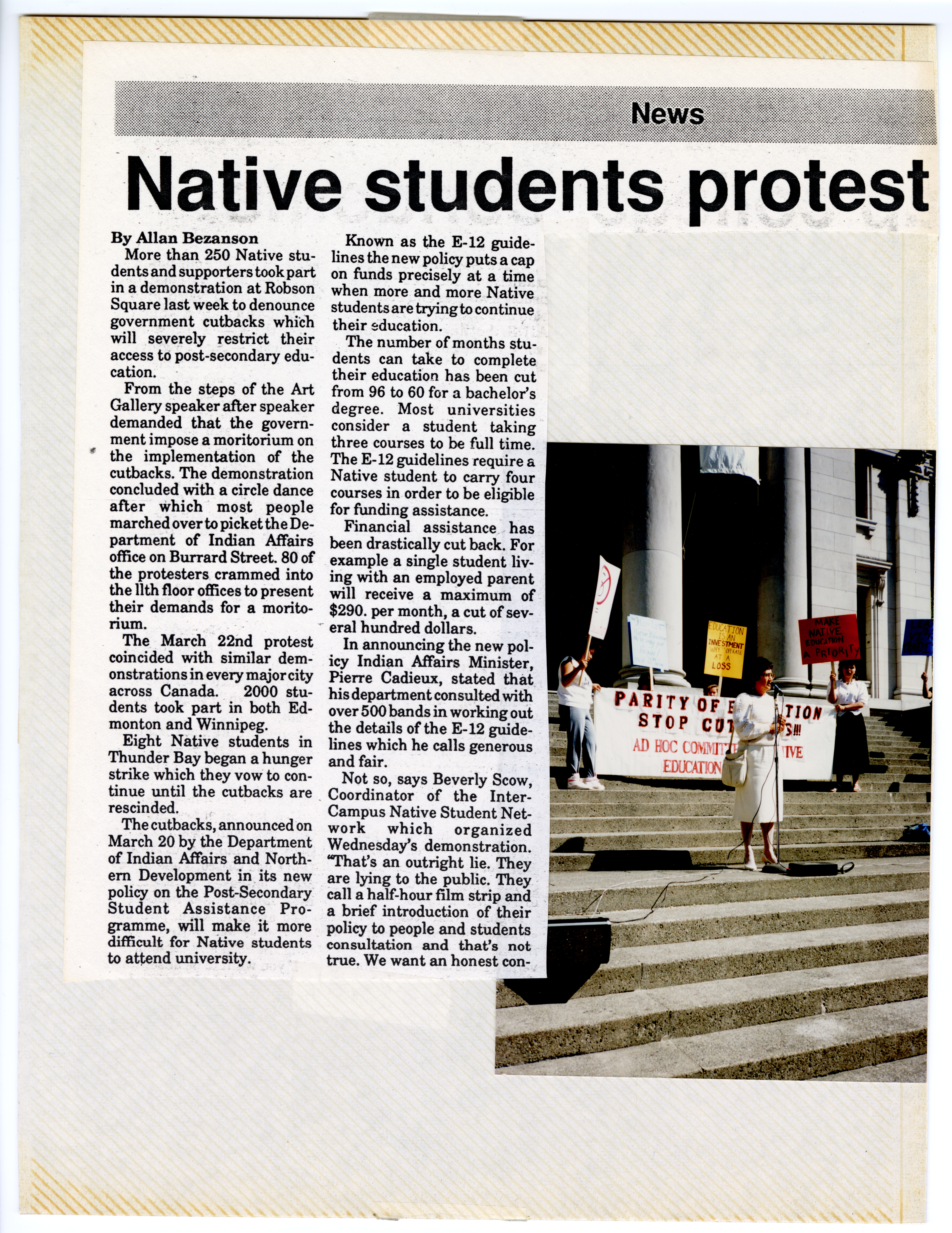 “PC 033 003_20”. "First Nations Protest Over Education Funding Cutbacks" Scrapbook. Accessed November 27, 2025. https://ubcischool.arcabc.ca/first-nations-protest-over-education-funding-cutbacks-scrapbook/pc-033-00320.