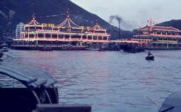 Tai Pak Seafood Restaurant, a multi-story floating restaurant, docked in Aberdeen Typhoon Shelter. Lights decorate the structures. Smaller boats float in the water alongside the restaurant, with mountains in the background. Annotation on slide reads, "Aberdeen nite." Image processing: rotated, cropped, reduced noise, adjusted colour temperature, adjusted black level.