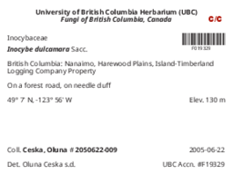F019329 Beaty Label Summary Content type Content type Digital Document Collection(s) Collection(s) Inocybe dulcamara Sacc. Resource Type Resource Type Text
