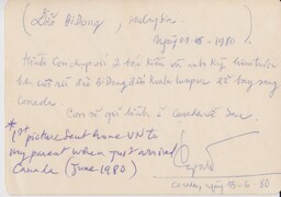 Refugee on Pulau Bidong Island - Verso Summary Content type Content type Image Collection(s) Collection(s) Journey to Freedom Resource Type Resource Type Photograph Genre Genre photographs Origin Information Origin Information Date Created/Date Issued 1980-06-15 Persons and Affiliations Persons Creator (cre): Nguyen, Doanh Abstract/Description Description / Synopsis Description / Synopsis A bilingual note from Doanh when he sent this photograph to his parents in Vietnam. Access and Rights Rights Statement Rights Statement IN COPYRIGHT - EDUCATIONAL USE PERMITTED Subjects and Classifications Keywords Keywords Refugees, boat people, family