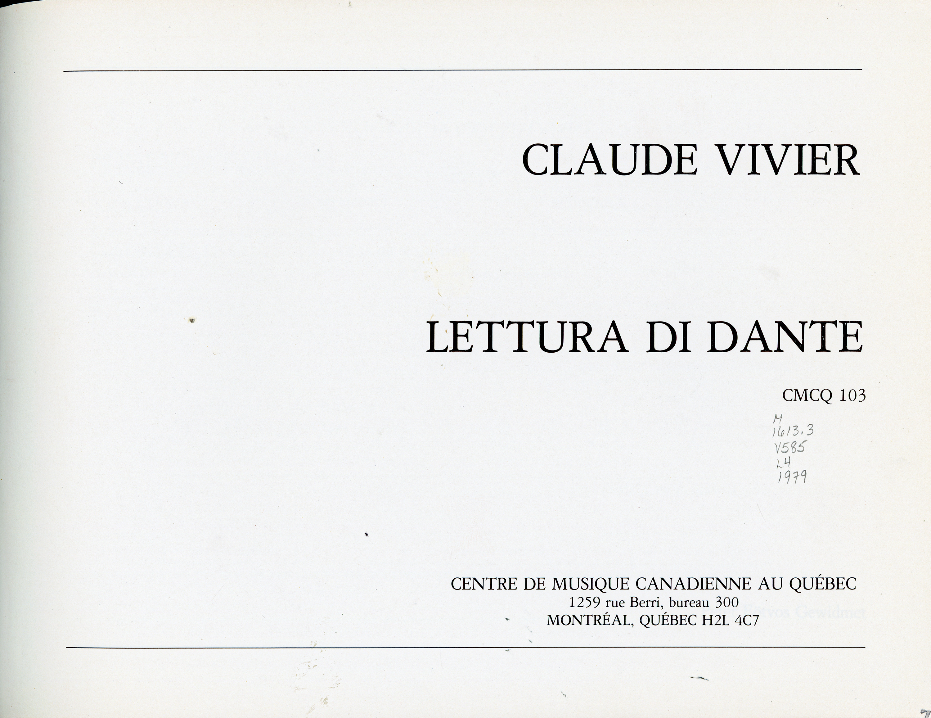 Lettura di Dante: Title page Summary Content type Content type Page Collection(s) Collection(s) Lettura di Dante Resource Type Resource Type Notated music Origin Information Origin Information Place Montréal Date Created/Date Issued 1979 Publisher Centre de Musique Canadienne au Québec Persons and Affiliations Persons Composer (cmp): Vivier, Claude Abstract/Description Description / Synopsis Description / Synopsis For soprano, oboe, clarinet, bassoon, trumpet, trombone, viola, and percussion. Duration: 27:00. Language Language French Identifiers Local Identifier Local Identifier M1613.3.V585 L4 1979 Subjects and Classifications Keywords Keywords Canadian Subject Topic Subject Topic Songs, High voice, with instrumental ensemble--Scores and parts.