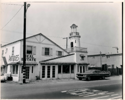 Black and white print of an old building housing an antiques stores and a real estate office in Huntington Beach, California with handwritten text on the back. On verso: "R. CUMMING 8/10/72.