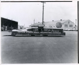 Black and white print of the side view of a United States Navy Recruiting Command parade float with Seapower for Peace detail on body in Seal Beach, California, with handwritten text on back. On verso: "R. CUMMING 1/73