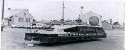 Black and white print of the front view of a United States Navy Recruiting Command parade float with Seapower for Peace detail on body in Seal Beach, California, with handwritten text on back. On verso: "R. CUMMING 1/73
