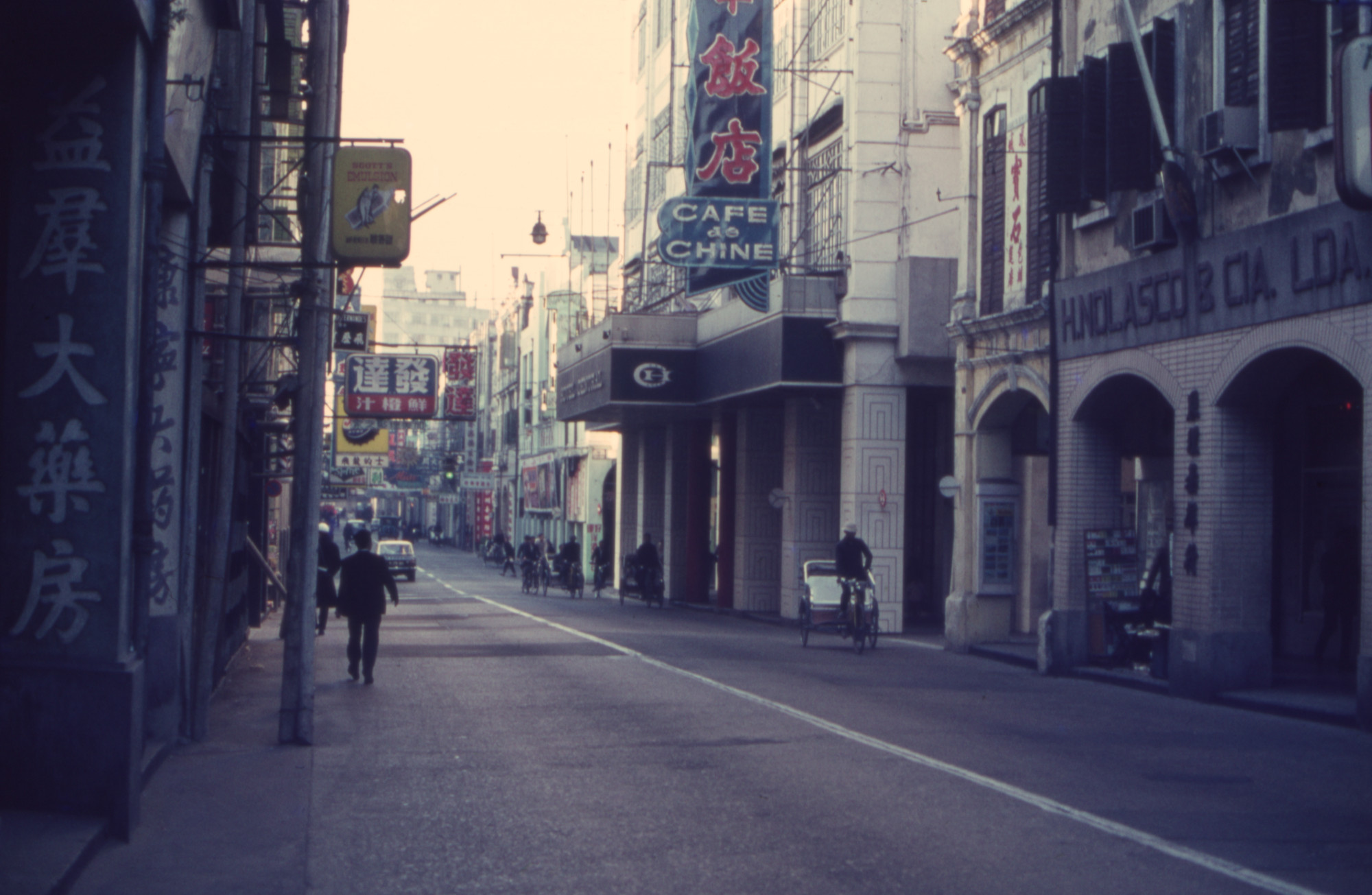 Busy street scene in Macau during the day. Multiple Chinese signs protrude over the road. Pedestrians are walking. Cars are in the distance. Multiple bicycles and cycle rickshaws are shown. Annotation on slide reads, "Main Rd | Macau." Image processing: reduced noise, adjusted colour temperature.