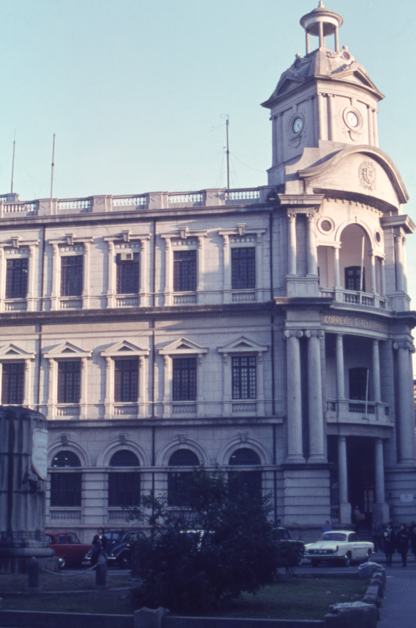 Construction of the post office (Correios e Telegrafos) was completed in 1929 [Source: Cultural heritage of Macau. (2015, June 16) AM009-Headquarters Building of the Post Office. Classified Immovable Properties. https://www.culturalheritage.mo/en/detail/99926] Cars and pedestrians are shown outside. A pedestal for a statue is missing its subject, Vicente Nicolau de Mesquita. The Statue of Lieutenant Mesquita at Senado Square was pulled down December 3, 1966 during the 12-3 incident [Source: Senado Square. (2025, Nov 20). In Wikipedia. https://en.wikipedia.org/wiki/Senado_Square] Annotation on slide reads, "Post office | 12/66 | No more Amaral..." Image processing: rotated, cropped, reduced noise, adjusted white point.