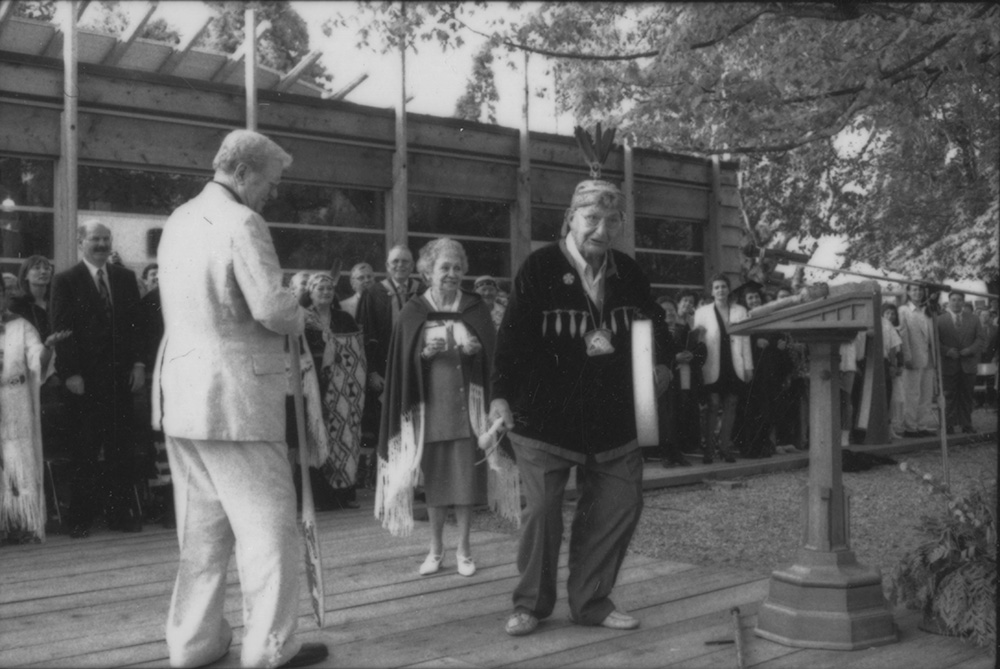 Chief Simon Baker playing the drum gifted to William Bellman at the naming ceremony, while Willam and June Bellman stand alongside him. |