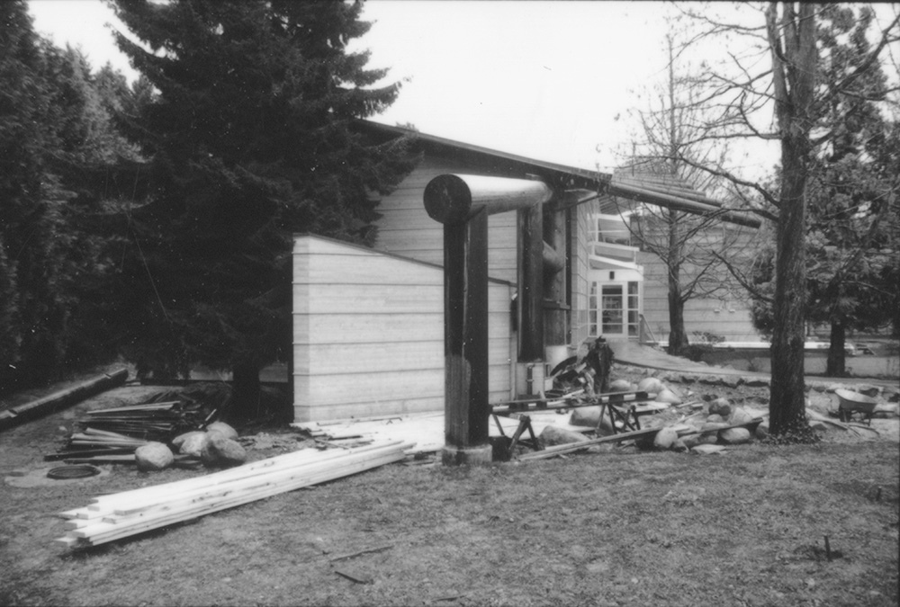 Partial back exterior of the First Nations Longhouse with a construction area can be seen. The logs of trees removed are used as landscape and there is the figure of an individual near the back center of the image. |