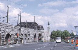 A bus stop, empty except for two buses in the distance. This would appear to be a bus stop next to, or close to, the Cologne Cathedral, because the annotation on the slide reads, "Cologne Germany / Bus Terminal / BTM of Cathedral." Image processing: rotated, cropped, clone-stamped dust marks in sky.