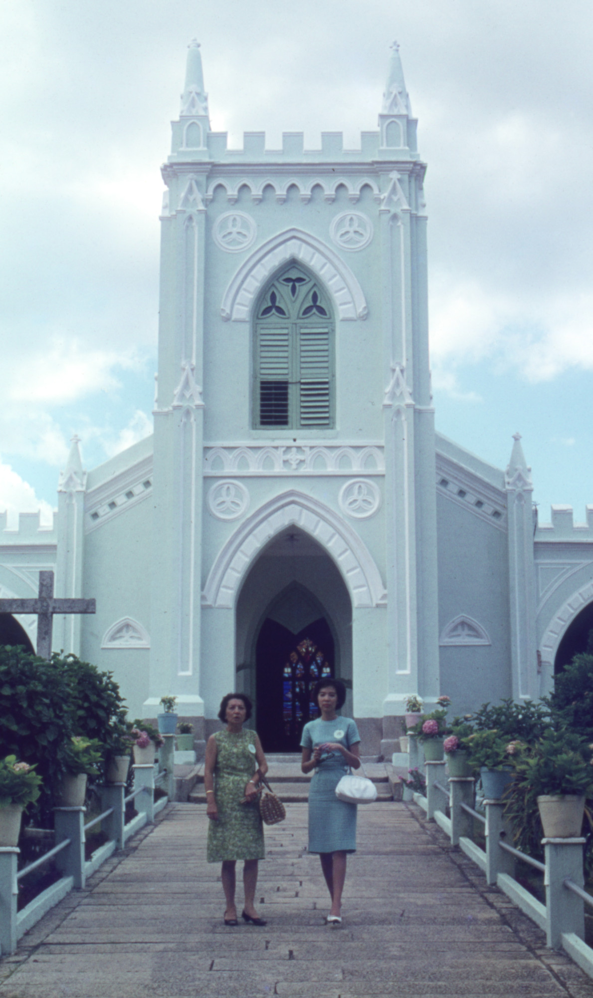 Blue-coloured Chapel of St. Michael (Capela de São Miguel) located in St. Michael the Archangel Cemetery (Cemitério de S. Miguel Arcanjo). Kathleen da Silva (L), unnamed woman (R). Annotation on slide reads, "Cemiterio | 5/66." Image processing: rotated, cropped, reduced noise, adjusted saturation, adjusted highlights and white point.