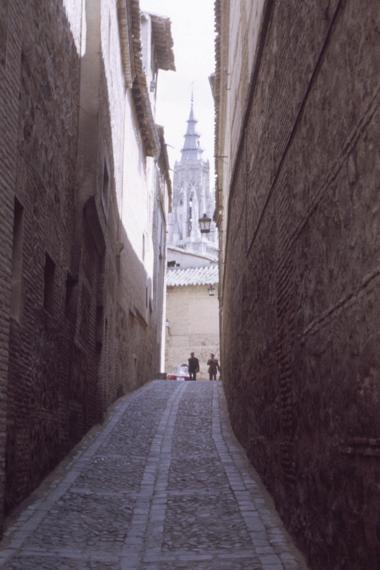 An alleyway in Toledo, shaded and deserted, except for two figures in the distance. The spire of a cathedral can be seen at the far end of the alley. Annotation on slide reads, "Narrow ST--Cathedral--Toledo." Image processing: rotated, cropped, adjusted levels.
