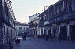 People walking on non-major road. Storefronts with Chinese signage. Bicycles and motorcycle parked. Blue car in background. Annotation on slide reads, "Macau St | 12/66." Image processing: reduced noise, adjusted saturation, adjusted colour temperature.