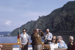 Peter da Silva is pictured standing in the company of a group of tourists onboard a ferry. A few tourists are seated, while two others stand. One man holds a camera and another wields a pair of binoculars. In the distant background appears to be the ruins of a castle on a hillside. Annotation on slide reads, "Rhine, Germany--Me and Scene." Image processing: rotated, cropped, sharpened, clone-stamped dust marks in sky.