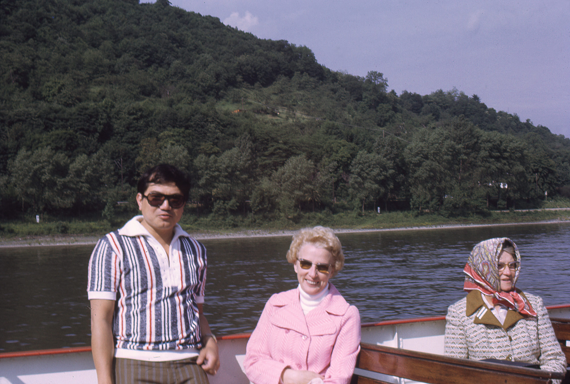 Peter da Silva poses next to an unidentified fellow passenger in a pink jacket onboard a ferry. Included in the photo, though not posing for the camera, is a woman in a headscarf. In the distant background can be seen the bank of the river and a rising hillside. Annotation on slide reads, "Rhine Germany." Image processing: rotated, cropped, sharpened, clone-stamped dust marks in sky.