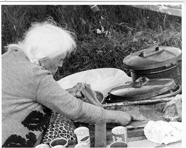 Image of Axu with a handwritten Anontations on the back "Axu cleaning salmon July 1975?" |