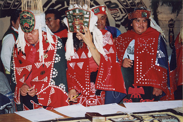 Image of Chiefs of the Northwest Coast First Nations witnessing the signing of the peace treaty between Kwakwaka'wakw and the Bella Coola at a Potlatch hosted by Chief James Sewid |