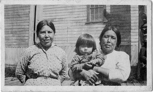 Image of Daisy Roberts and Q̓acuǧow, the mother of Moses Alfred. Q̓acuǧow holds her granddaughter, Flora Alfred. |