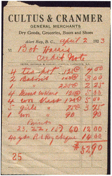 Credit note from Cultus & Crammer, General Merchants, to Bob Harris |