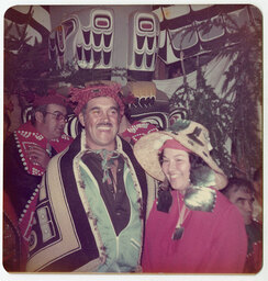 Image of Lorne Smith wearing the Chilkat blanket that Daisy passed on to him as a dowry.The abalone shells and other huge pieces of abalone shell ornaments decorating her noble’s hat were distributed by Axu to certain women at the end of the wedding ceremony. |