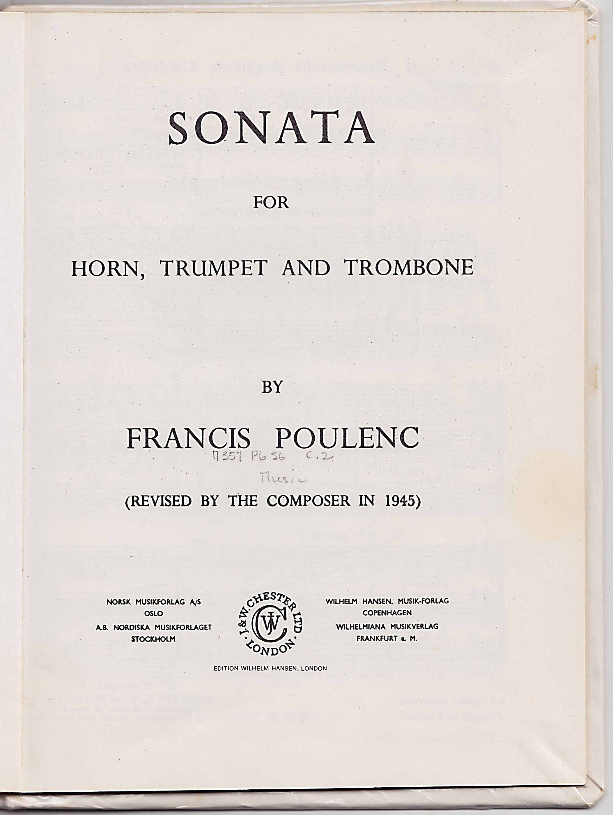 Summary Content type Content type Page Collection(s) Collection(s) Sonata for horn, trumpet and trombone Resource Type Resource Type Notated music Origin Information Origin Information Place London Date Created/Date Issued 1924 Publisher J. & W. Chester Persons and Affiliations Persons Composer (cmp): Poulenc, Francis Abstract/Description Description / Synopsis Description / Synopsis 1 miniature score (15 pages). 20 cm. Language Language English Identifiers Local Identifier Local Identifier M357.P6 S6 Subjects and Classifications Keywords Keywords French; LGBTQ+ Subject Topic Subject Topic Brass trios--Horn, trombone, trumpet